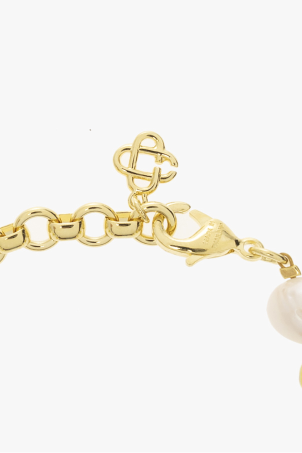 Gold-tone bracelet from Casablanca. Crafted from gold-plated brass and trimmed with faux pearls, this item adjusts via a lobster clasp and features a logo-shaped pendant, a motif of laurel leaves , mushrooms and tennis balls covered with colourful enamel.