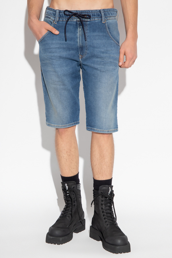 Dark blue ‘D-KROOSHORT’ denim shorts from Diesel. Made of soft Joggjeans®, this pair is complete with an elastic drawstring waistband, zip fastening, logo patch, three front pockets and two back pockets.