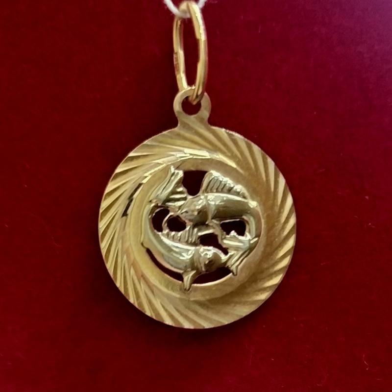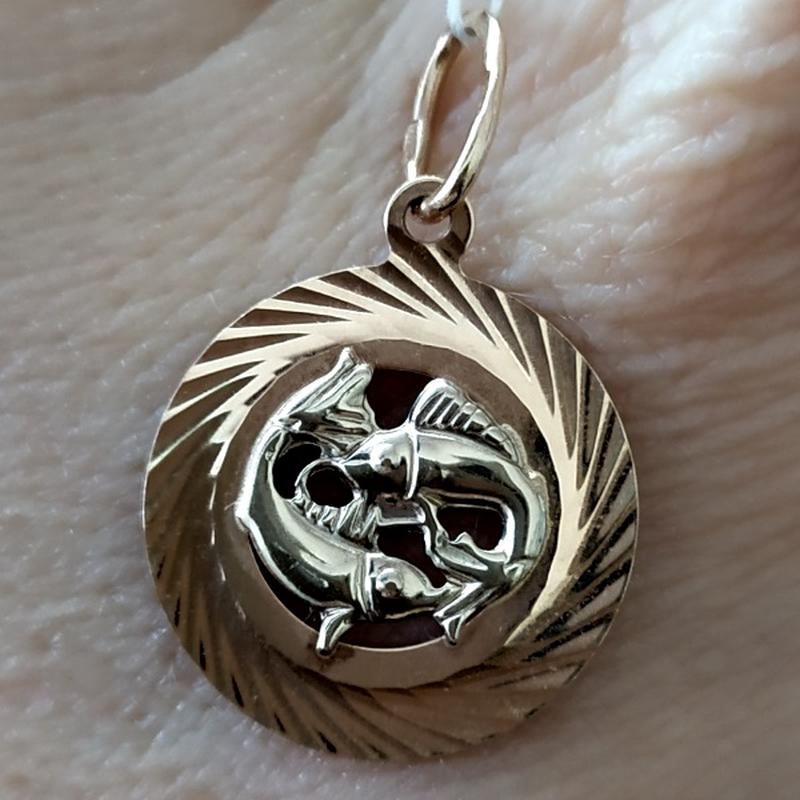 Подвес знака зодиака Рыбы изготовлен из золота 585 пробы. Фигурки рыб выполнены в белом цвете золота и закреплены в центре круга , украшенного резьбой.