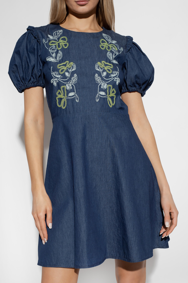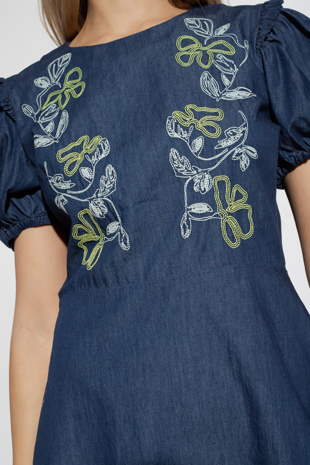 Navy dress from PS Paul Smith. Fastened with a back zip, this round neck design features stitching details to the front, embroidered floral motif and short sleeves with ruffles and ribbed cuffs.