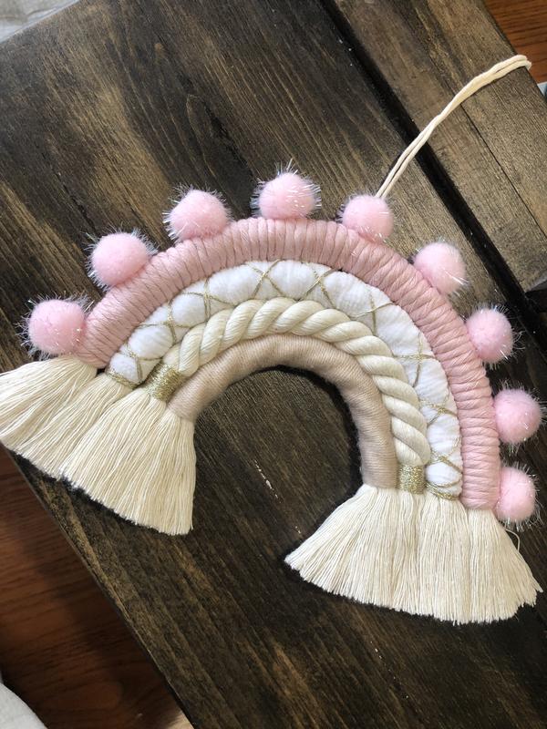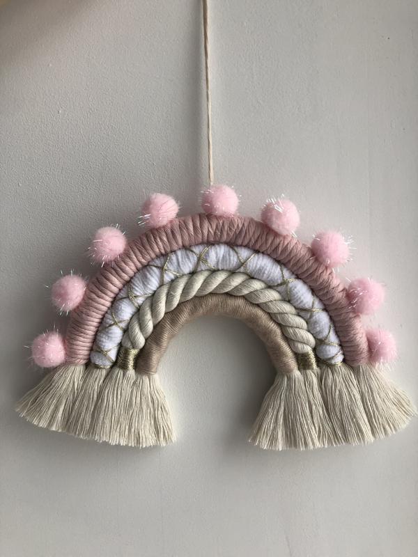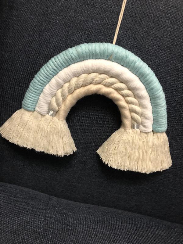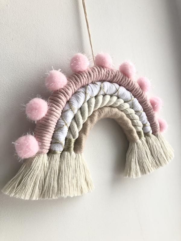 Веселка в стилі макраме, ручна робота. Можна на подарунок, йде в подарунковій упаковці. Можна прикрашати дитяче ліжечко і просто дитячу кімнату. Ширина 23 см, висота 16 см. Колір може бути любий від побажання клієнта. Орієнтовний час виготовлення 1-3 робочих дні