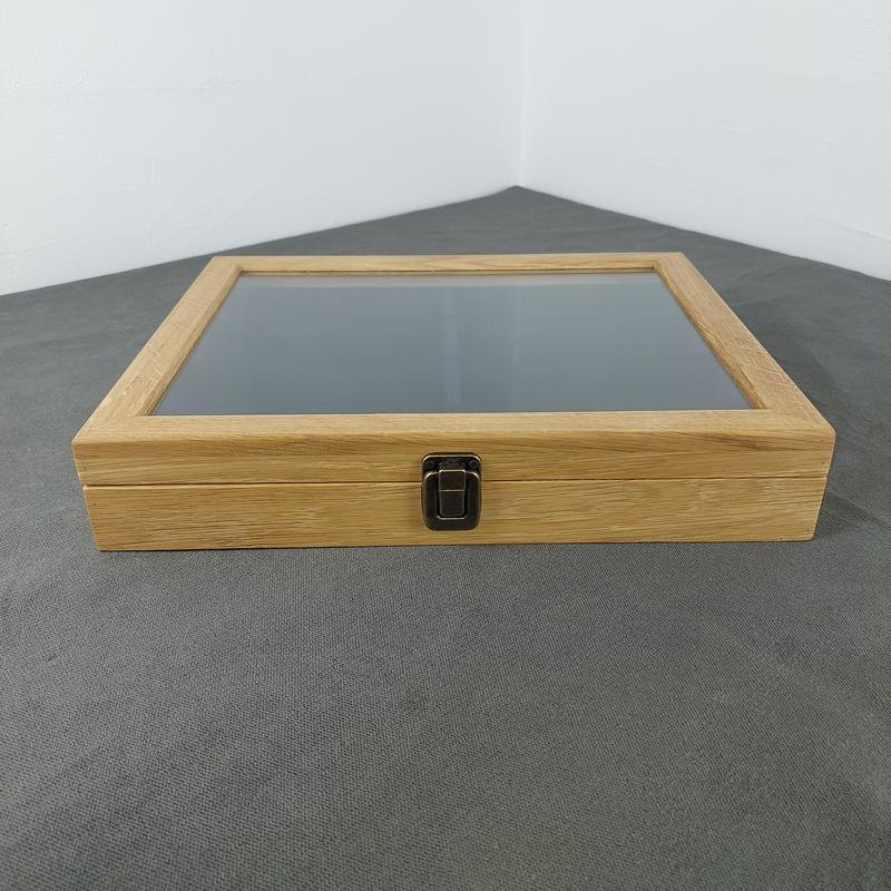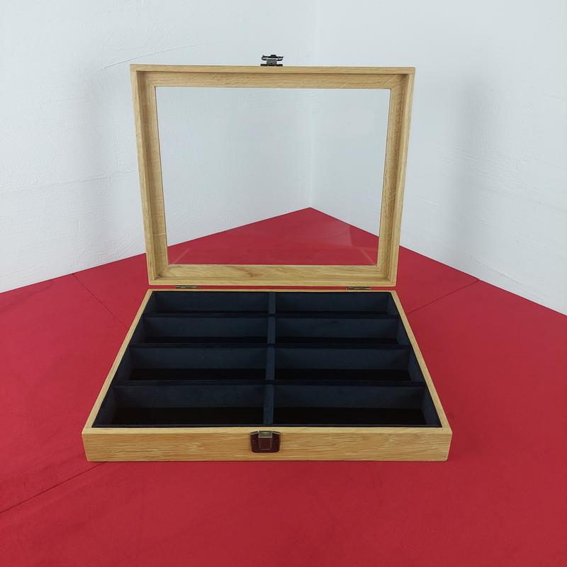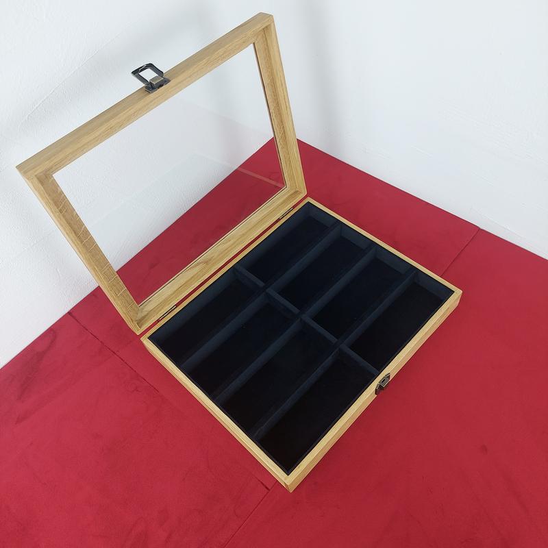 Шкатулочка для хранения 8 очков с дерева Дуб , 340*280*60мм, Wooden Organizer изготовлена из натурального премиум класса дерева дуб, с крышкой со стеклом. Покрытая масло – воском. Обшитая внутри тканью бархат черного цвета, очень мягкая и приятная на ощупь защищает Ваши изделия от пыли, грязи, царапин и случайных ударов.