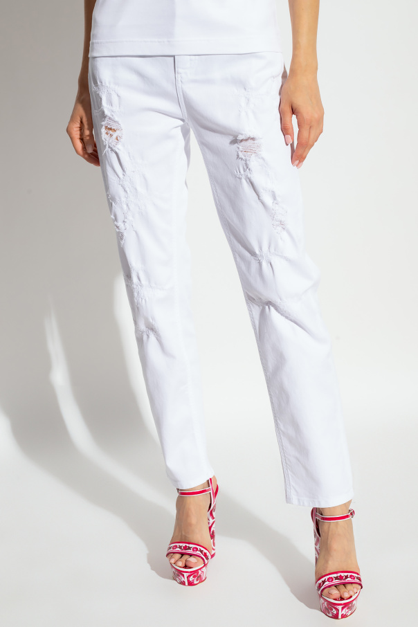 White boyfriend jeans from Dolce & Gabbana. Enriched by distressed details, this pair features a zip fly with a button, classic five pockets, a patch on the front and a logo application on the back.