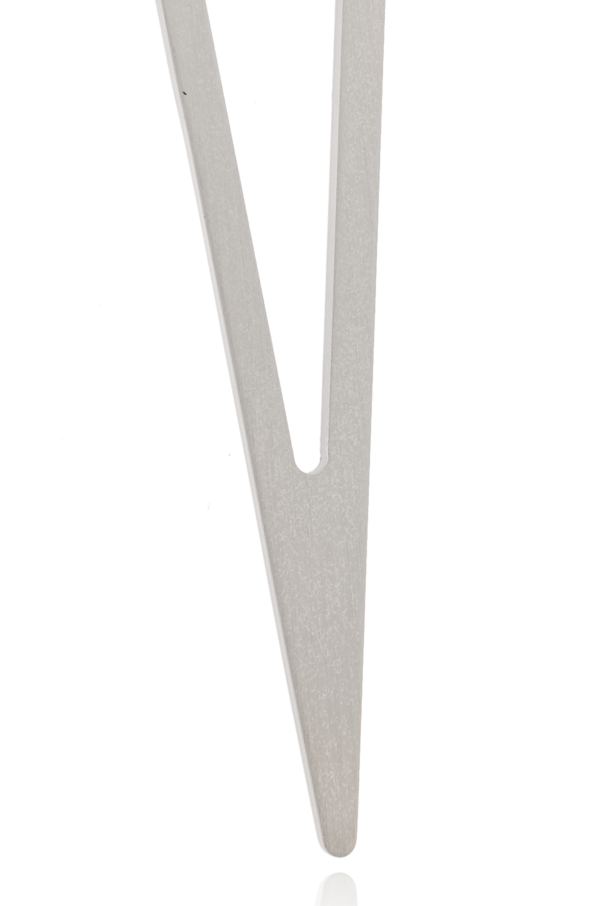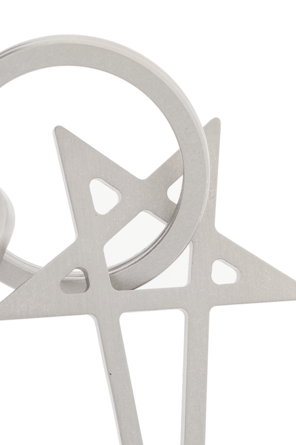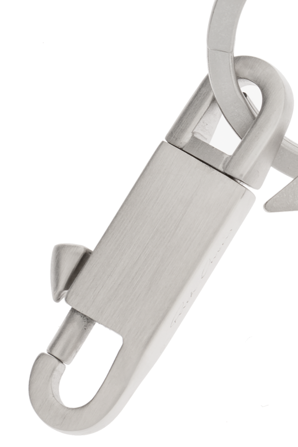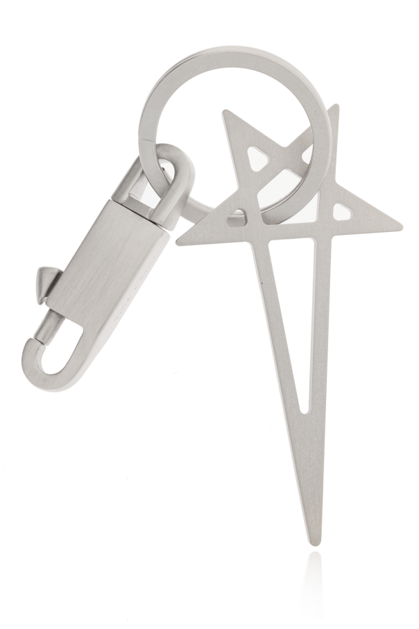 Introducing the Rick Owens Logo Keychain, an epitome of modern elegance and minimalist design. This exclusive accessory, in a resplendent silver hue, is meticulously crafted from a blend of iron, brass, and aluminum, ensuring both durability and a sophisticated matte finish. The keychain\'s geometric shape features a star-like cutout, accentuated by a long, pointed element, adding a touch of uniqueness to its form. Its solid carabiner clasp allows for effortless attachment to keys or bags, making it a versatile addition to any ensemble. This stylish accessory is designed by the renowned American fashion designer Rick Owens, celebrated for his avant-garde approach and sculptural expertise, leaving an indelible mark on contemporary fashion. Why Choose This Product? Timeless geometric design with a star motif. Durable metal composition with a matte finish. Secure and convenient carabiner clasp. Created by acclaimed designer Rick Owens. Perfect complement to any sophisticated style.