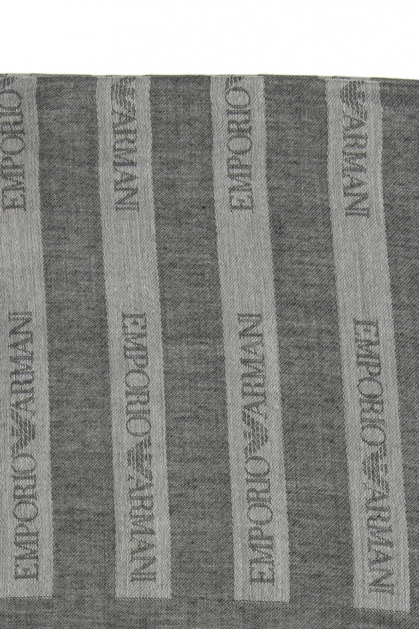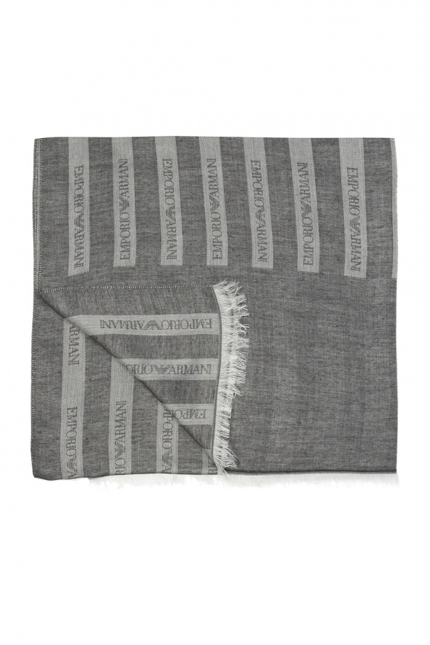 Grey scarf from Emporio Armani. Flaunting a jacquard logo for the brand\'s recognition, this item is complete with fringed edges.