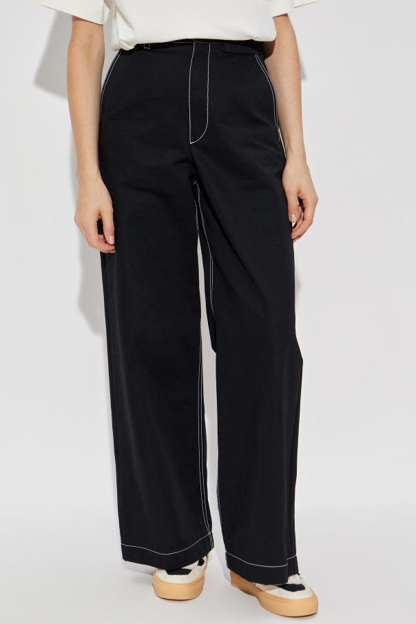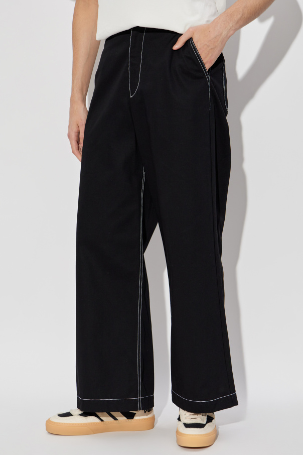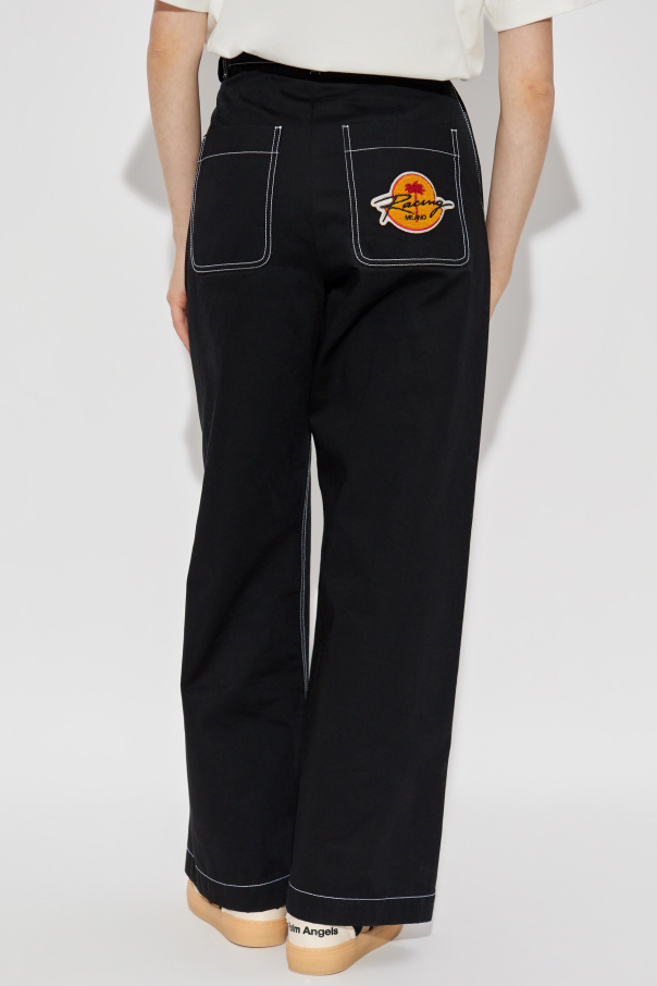 Introducing the 8 MONCLER PALM ANGELS trousers, a quintessential piece from the illustrious Moncler Genius collection. Crafted from sumptuous cotton, these trousers epitomize the seamless fusion of casual elegance and contemporary design. The trousers boast a dominant black hue, accentuated by white, contrasting stitches that exude understated sophistication. Designed with a loose fit and wide legs, these trousers provide unparalleled comfort and style. The high waist, accompanied by a belt, accentuates the silhouette, ensuring a flattering fit. Distinctive features include two back pockets with prominent stitching and a chic patch featuring the \"Racing Milano\" logo and a palm motif, adding a touch of urban flair. Fastened with a zip, hook, and button, these trousers promise a secure and tailored fit. Why Choose This Product? Exquisite craftsmanship with 100% high-quality cotton. Striking design with contrasting stitches and unique logo detailing. Part of the exclusive Moncler Genius collaboration with Grammy winner Alicia Keys. Perfect blend of streetwear inspiration and modern elegance.