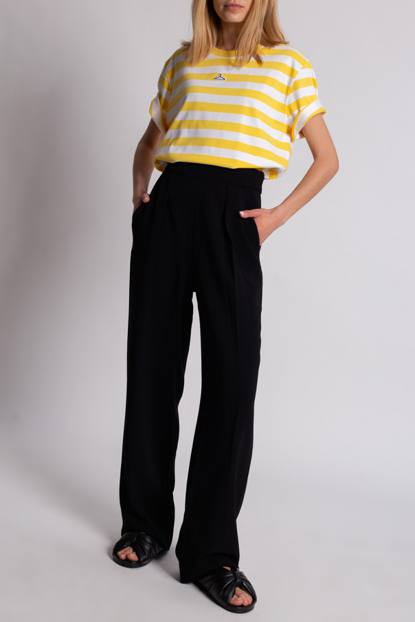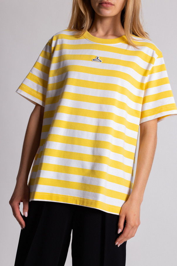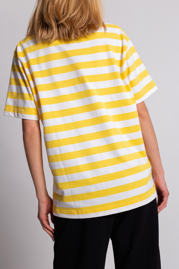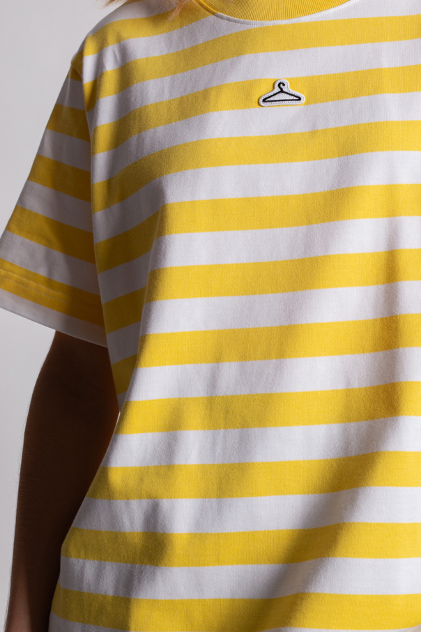 White and yellow crewneck T-shirt from Holzweiler. Crafted from organic cotton with all-over stripes, this style features short sleeves, rib detailing on the collar and a black and white logo patch.