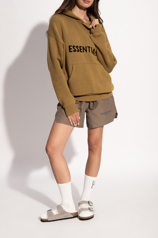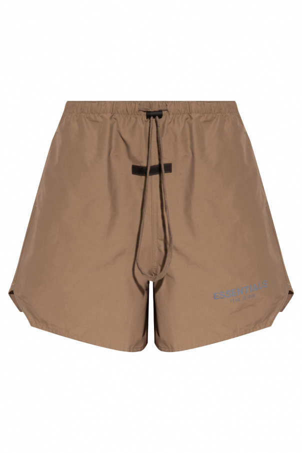 Khaki shorts from Fear Of God Essentials. Fastened with drawstrings, this pair features a silver-tone reflective logo detail, two front pockets and one back pocket.