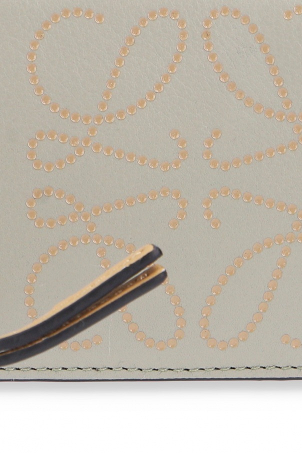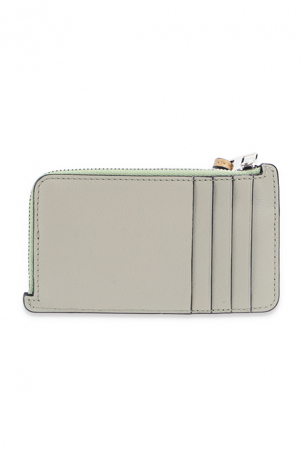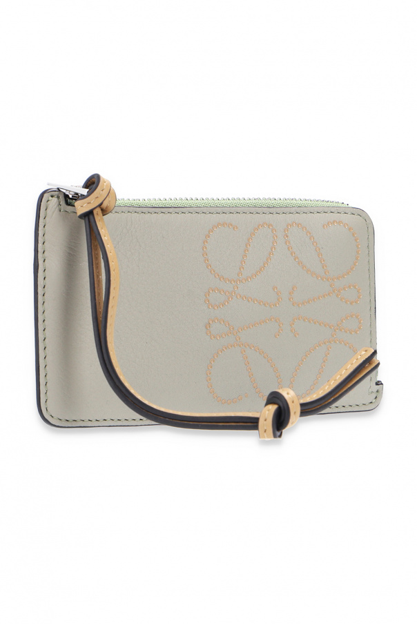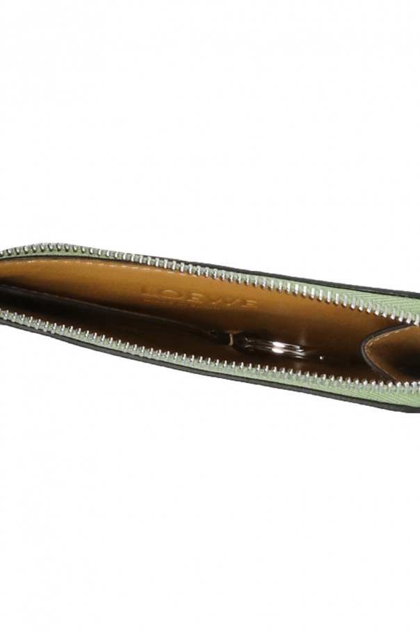 Green key holder from Loewe. Made of leather, this item fastens via a zip and showcases an embossed logo motif in yellow. It is complete with four card slots and one slip pocket.