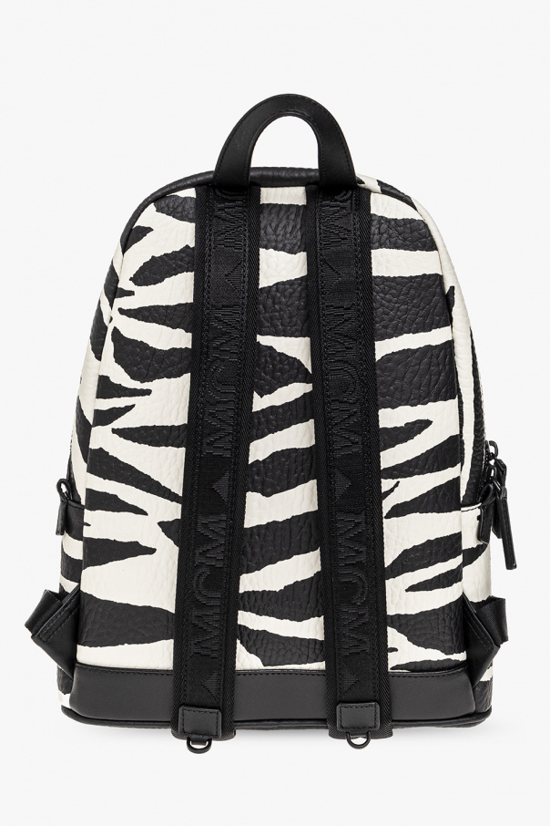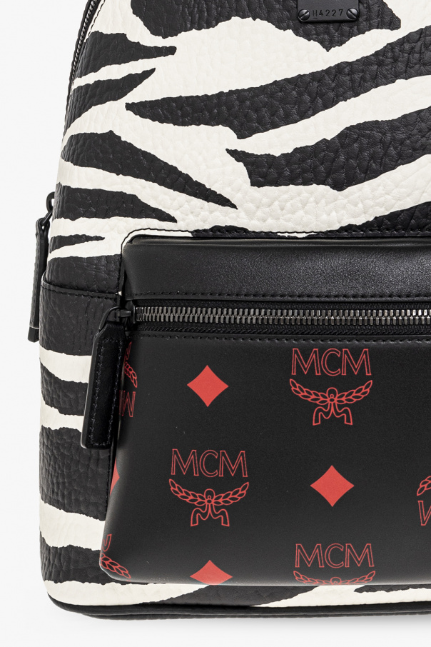 Cream, black and red backpack from MCM. Crafted from faux leather embellished with an animal motif and the brand's ‘Visetos’ monogram, this design features a two-way zip fastening, logo-engraved hardware accompanied by a zip pocket on the front, a top handle, adjustable shoulder straps, silver-tone metal elements and one internal compartment with two slip pockets.