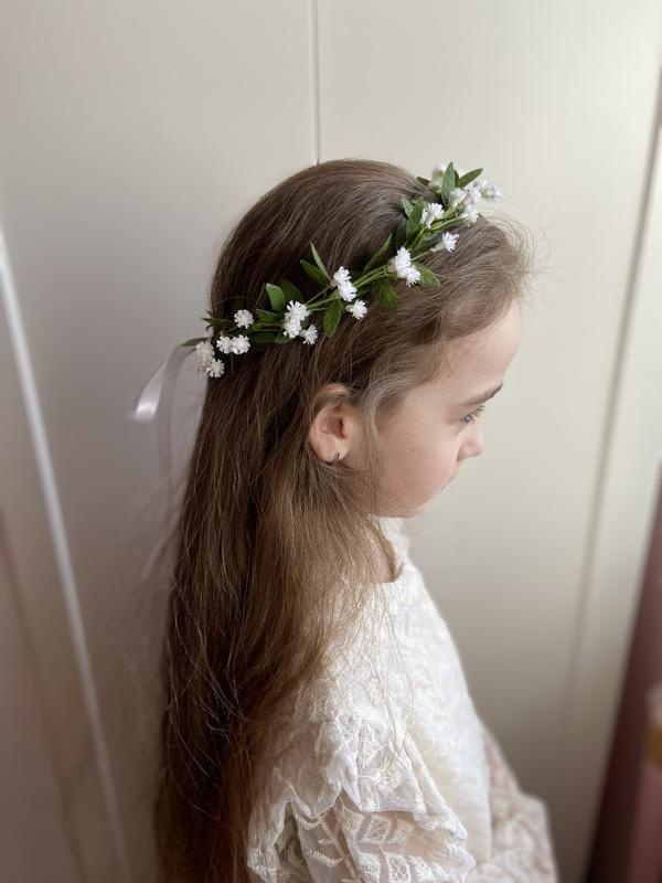Нежный веночек для первого причастия для свадьбы и других событий. Венок сделан из польских белых мелких цветов и листьев-пластик. Размер венка регулируется органзовою лентой. Венок подходит взрослым и ребенку. На фото девочка с обхватом головы 54 см ( среднестатистический размер головы взрослого и ребенка,так же будет выглядеть на взрослом).