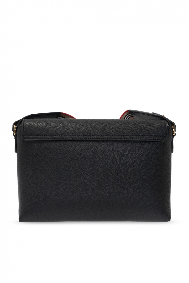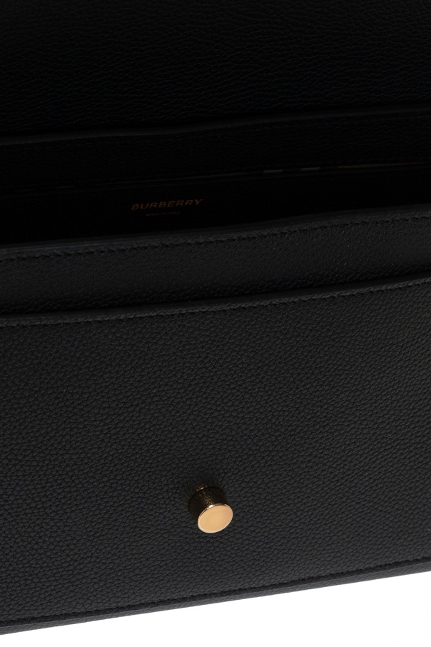 Black ‘Note’ shoulder bag from Burberry. Crafted from calf leather, this design secures with a gold-tone logo-engraved fastener and employs a detachable and adjustable shoulder strap, gold-tone metal fittings and interior with one compartment and two slip pockets.
