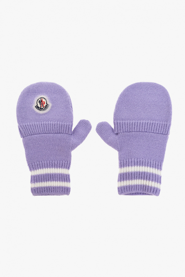 Purple fingerless gloves from Moncler. Made of wool, this pair features a logo detail, mitten cover and ribbed edges with a stripe pattern.
