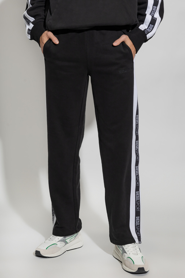Black ‘AMSB-JAGER-HT33’ sweatpants from Diesel, the ‘DIESEL SPORT’ collection. Fastened with drawstrings, this straight leg pair features two front pockets and logo-embroidered side stripes in black and white.