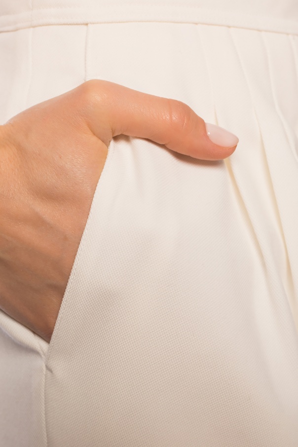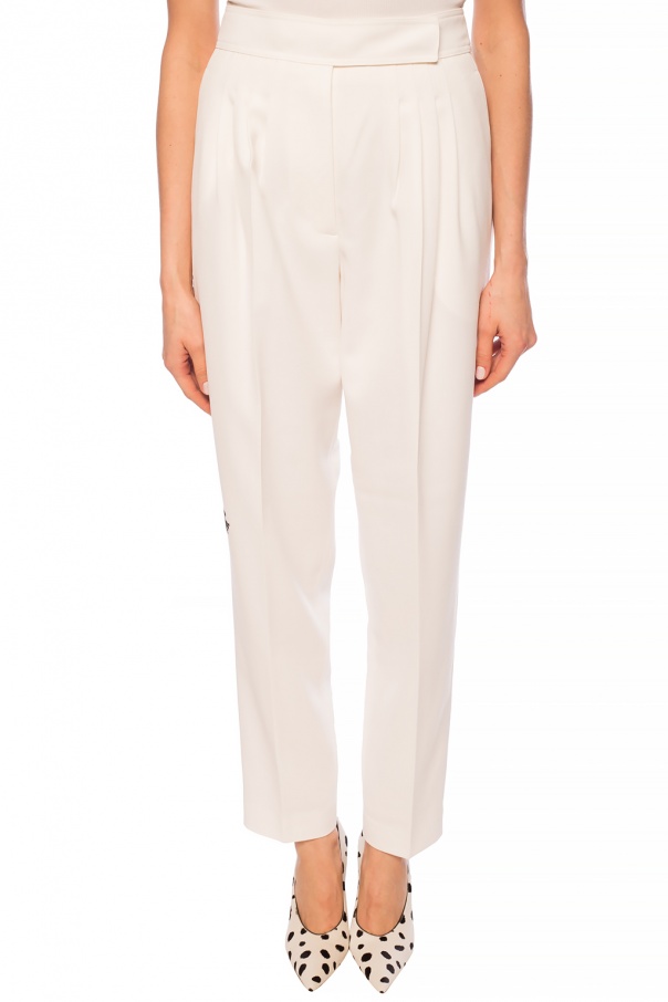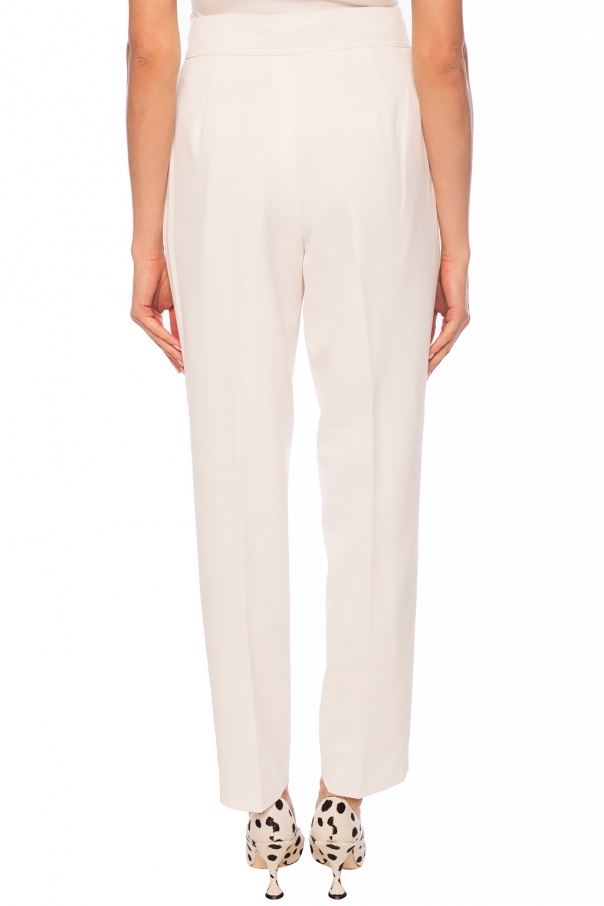 White trousers from Balmain. Fastened via zip, hook and button. Embellished with black rubberised logo detail. Feature high rise, pleats around the waist and 2 slant front pockets.