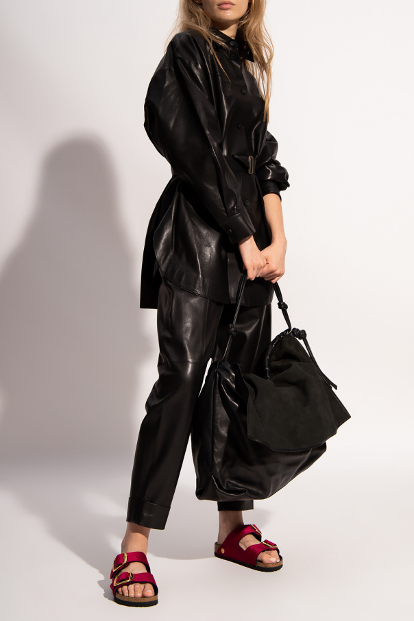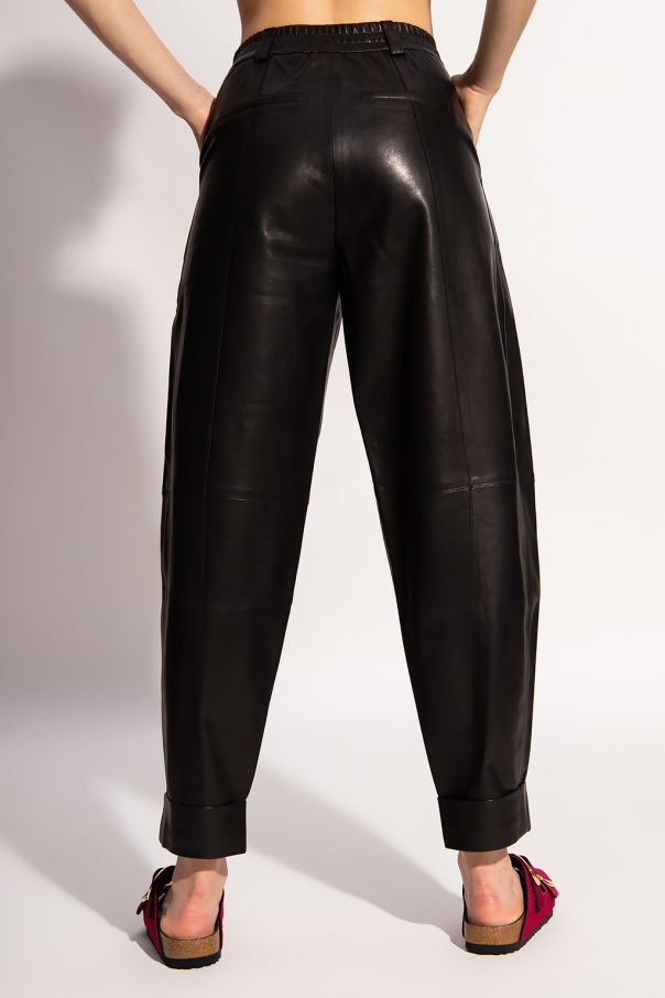 Black trousers from Aeron. Crafted from lamb leather, this pair features a zip fly with buttons, four slip pockets, exposed stitching details and turn-up cuffs.