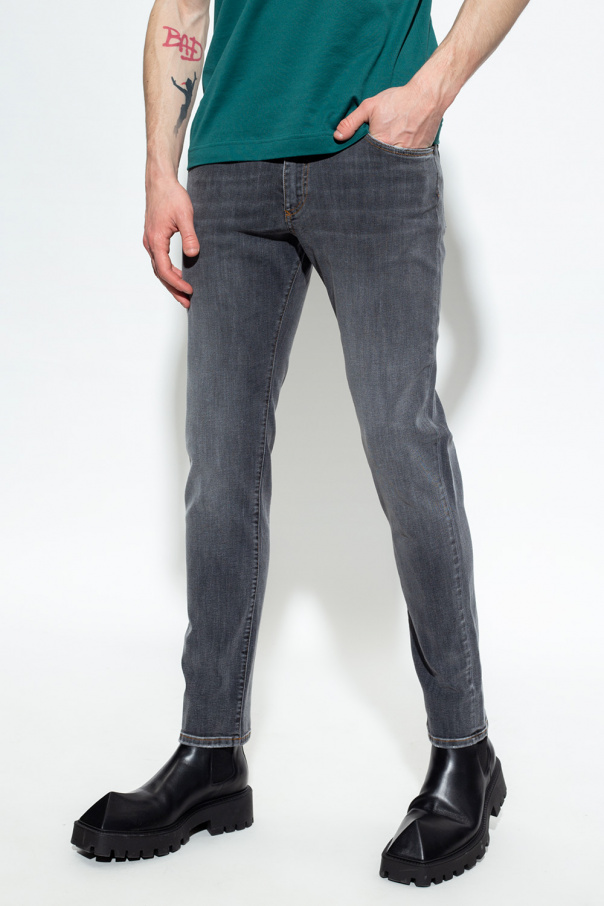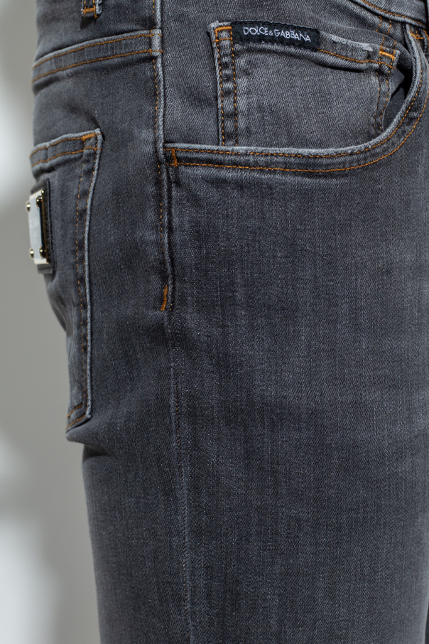 Grey jeans from Dolce & Gabbana. Cut with a slim, this pair features a zip fly with a button, classic five pockets, tapered legs and a branded patch on the back.