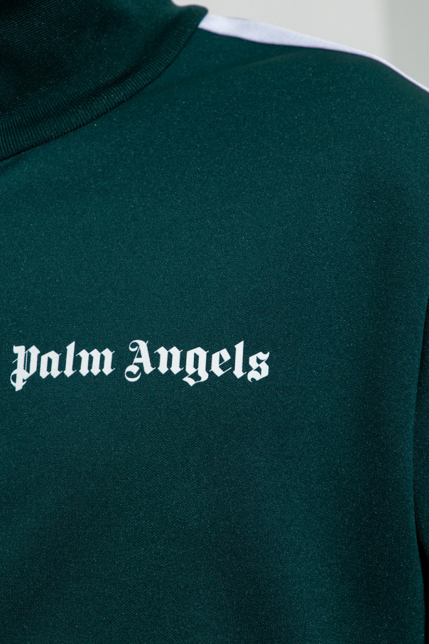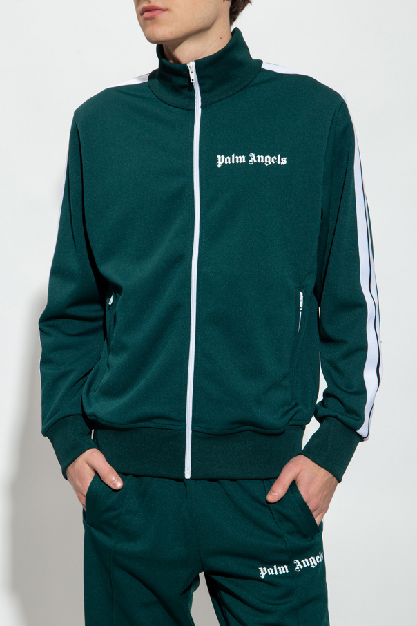 Green track jacket with a high neck from Palm Angels. Fastened with a zip, this garment features a white logo print, two zip pockets, white and black stripes at the sleeves and ribbed trims at the neck, hem and cuffs.