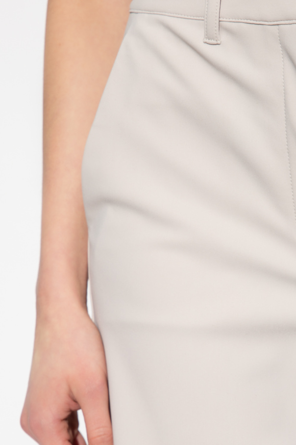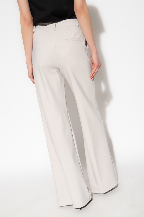 Grey pleat-front trousers from Theory. Falling with flared legs, this pair features a zip fly with a button and hook, two side seam pockets and one back pocket.