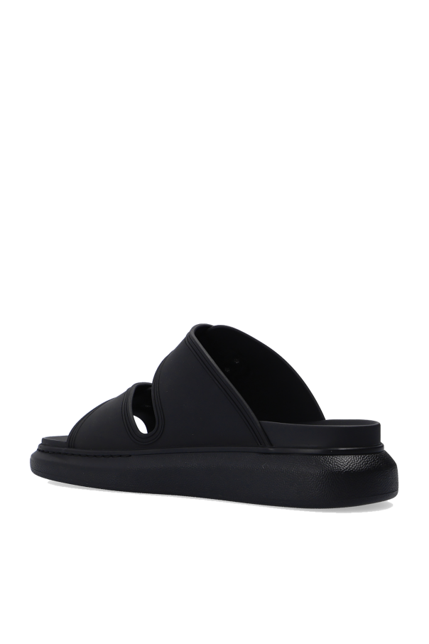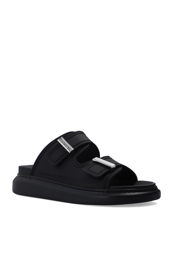 Black slides from Alexander McQueen. Resting on a black rubber sole, this pair features an embossed logo and straps with silver-tone buckles.