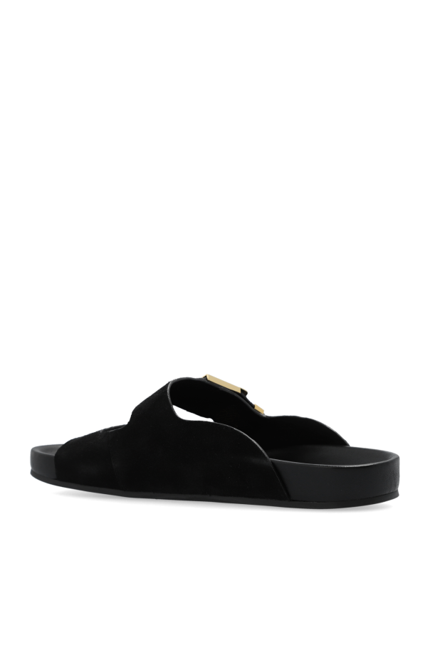 Black slides from Lanvin. Made from suede, this model sits on a black rubber sole and showcases a gold-tone buckle fastening with an engraved logo.
