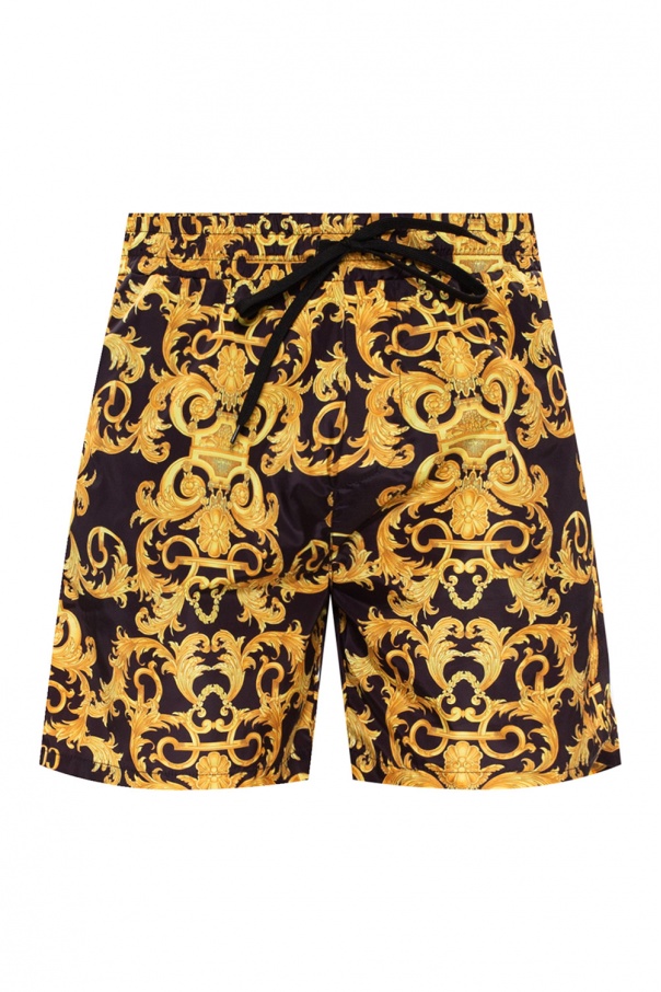 Black swim shorts from Versace Jeans Couture. Illustrated with the brand\'s iconic Barocco print with an accompanying logo in yellow, this pair is complete with an elasticated waistband with a drawstring fastening and two side seam pockets.