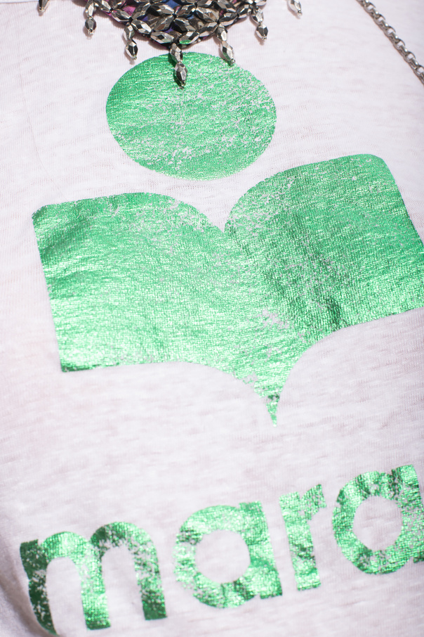 White crewneck T-shirt from Isabel Marant Étoile. Made of linen, this garment is decorated with green logo print with a metallic finish.