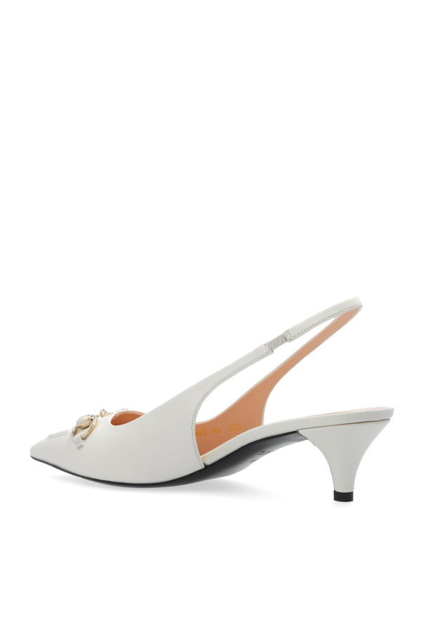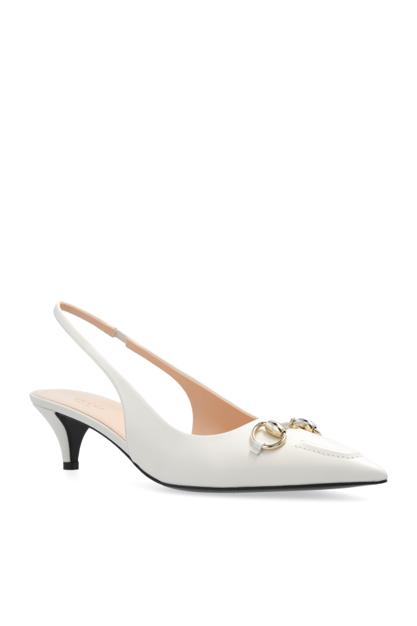 Introducing the quintessence of modern elegance and craftsmanship: Gucci\'s Cream Leather Heeled Shoes. Fashioned from the finest leather, these shoes epitomize luxury with their creamy exterior and warm, beige interior, creating a harmonious contrast that pleases the eye. Featuring a pointed toe and a medium-height heel, these shoes offer a sublime balance between comfort and sophistication. The presence of a distinctive light gold metal buckle, shaped in the iconic Gucci horsebit design, at the front adds a touch of refined character, setting these shoes apart as a hallmark of fashion-forward elegance. The construction of these shoes is solid, indicating the high-quality leather used, which is a staple of exclusive fashion brands. Designed to complement a variety of outfits, from formal to business and even casual ensembles, these shoes are versatile yet always maintain an air of exclusivity, underscored by the subtle designer logo that serves as a stamp of luxury and brand identity. Why Purchase These Gucci Heels? Made entirely of premium leather, ensuring durability and comfort. Elegant cream color, versatile for any outfit. Unique Gucci horsebit metal buckle, adding a refined touch. Perfect balance of heel height for both comfort and sophistication. Renowned Gucci craftsmanship, a testament to quality and style.
