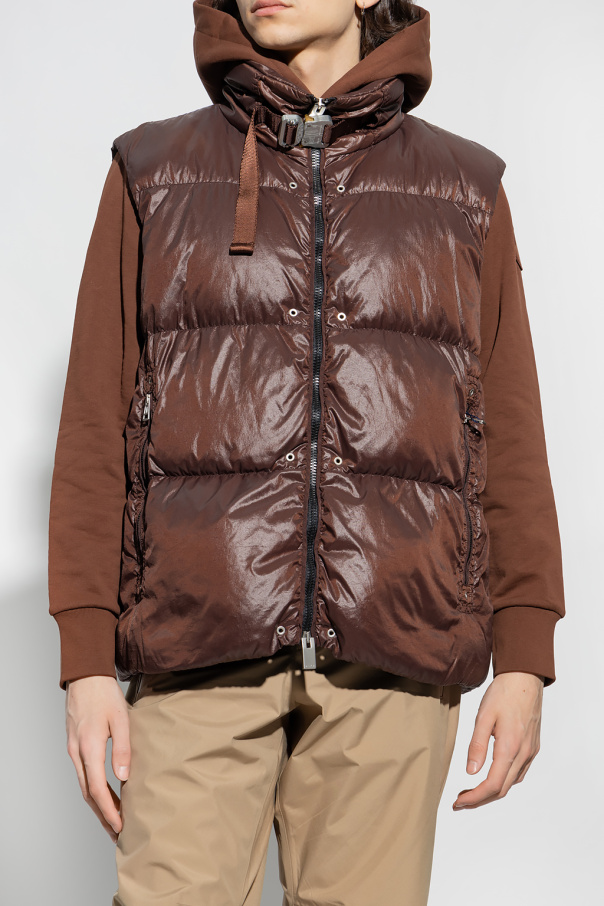 Brown ‘Islote’ quilted down jacket from Moncler Genius, the ‘6 Moncler 1017 ALYX 9SM’ collection. Fastened with a two-way zip, this design features a stand collar with an adjustable strap and the brand\'s signature rollercoaster buckle in silver-tone and gold-tone, logo patch at the back and two zip pockets.
