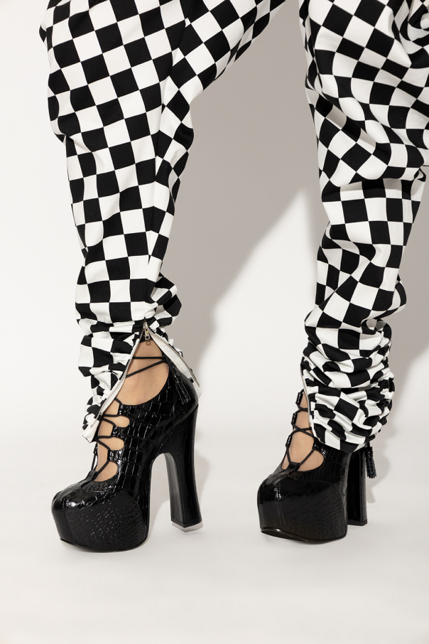 Black ‘Elevated Ghille’ platform boots from Vivienne Westwood. Made of leather with a crocodile skin effect, this pair features decorative ankle ties and black leather sole.