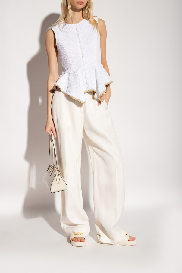 Cream slides from Tory Burch. Made of leather, this model features a gold-tone application with a braided logo and a cream chunky sole with a rubber trim.