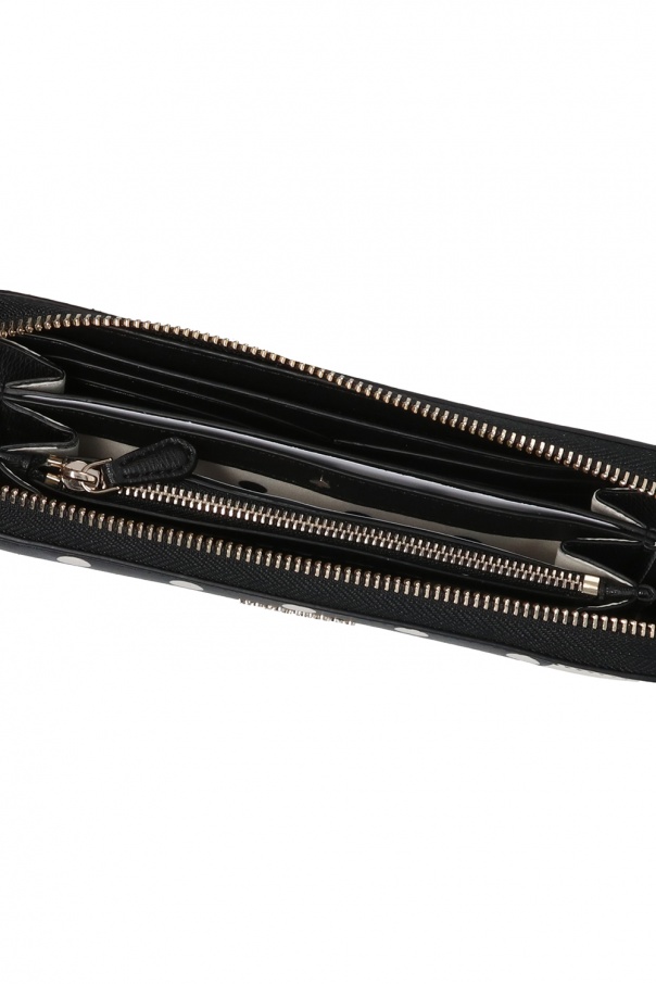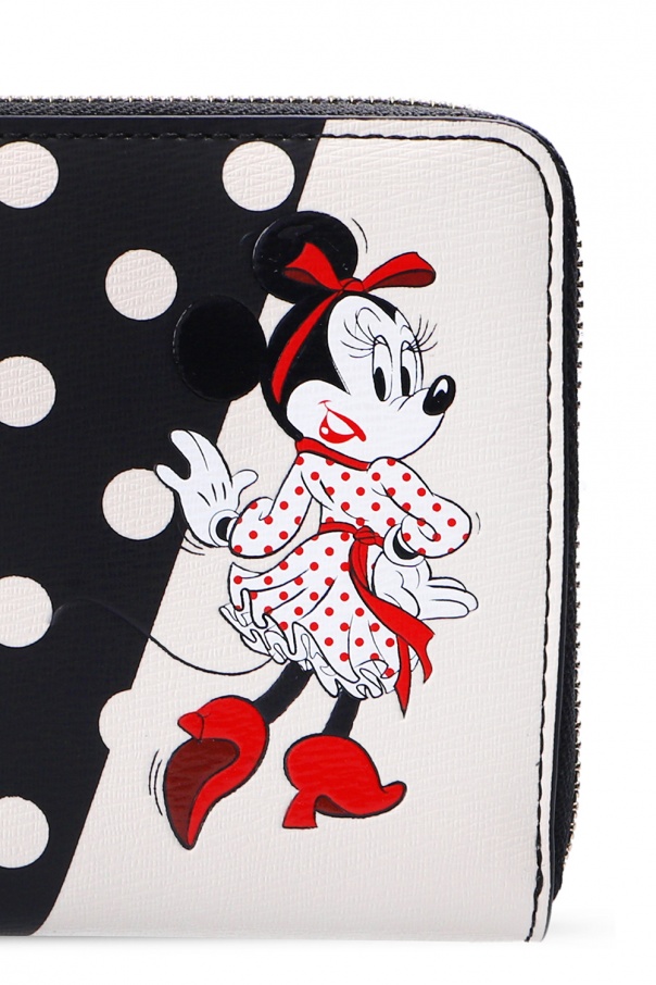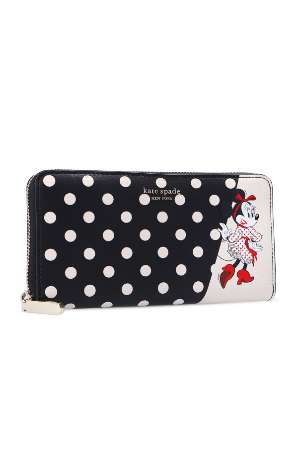 Black and white wallet from Disney Minnie Mouse x Kate Spade. Fastened with a zip, this design is decorated with a colorful ‘Minnie Mouse’ motif, polka dot pattern, metal logo detail and silver-tone metal hardware. It features a back slip pocket as well as three bill compartments, three slip pockets, zipped coin pocket and twelve card slots inside.