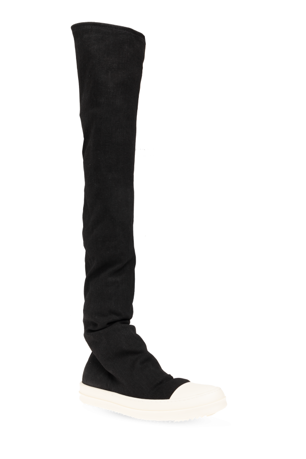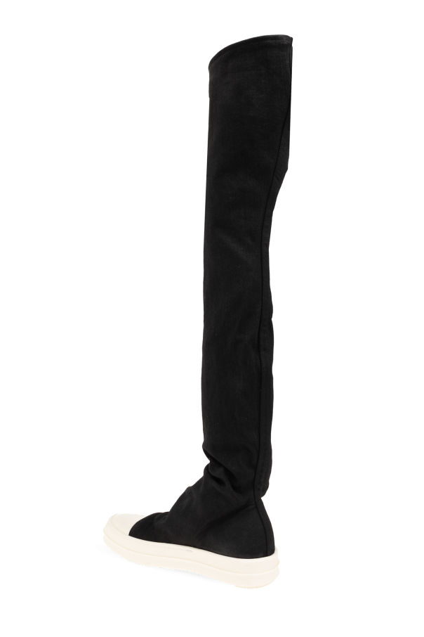 Black sneakers with over-the-knee socks from Rick Owens DRKSHDW. Made of cotton with a wax matte finish, this pair is set on a cream platform sole.