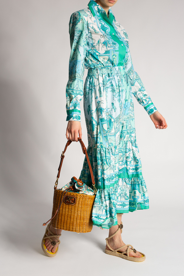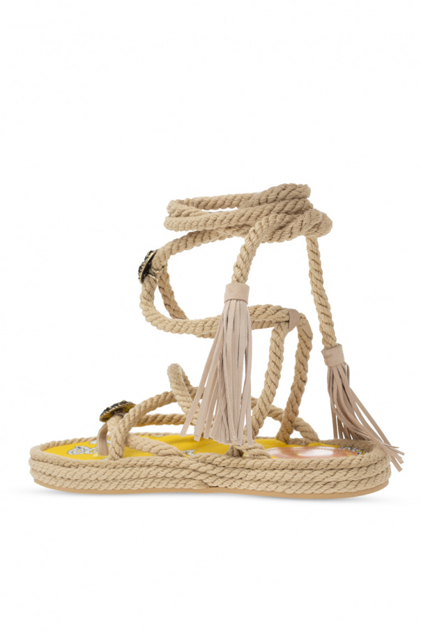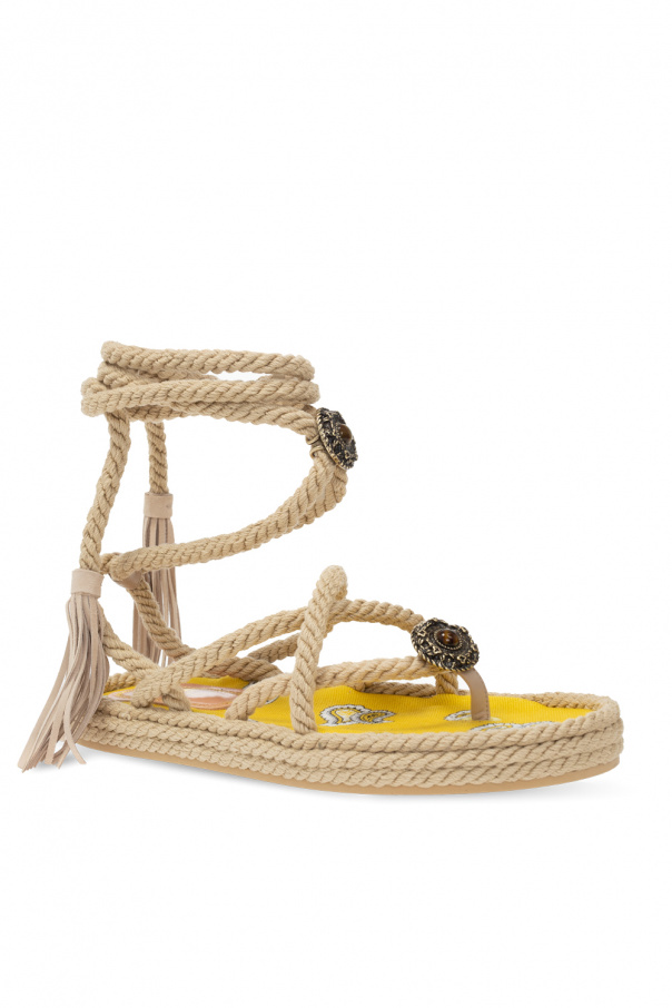 Beige woven platform sandals from Etro. Fastened with ties, this pair is complete with a decorative appliqué and a beige rubber sole.