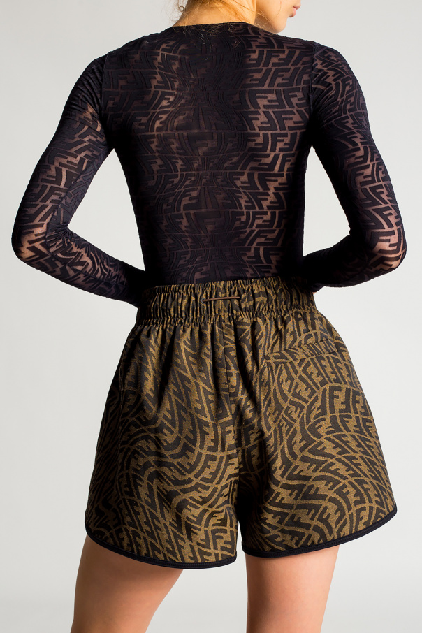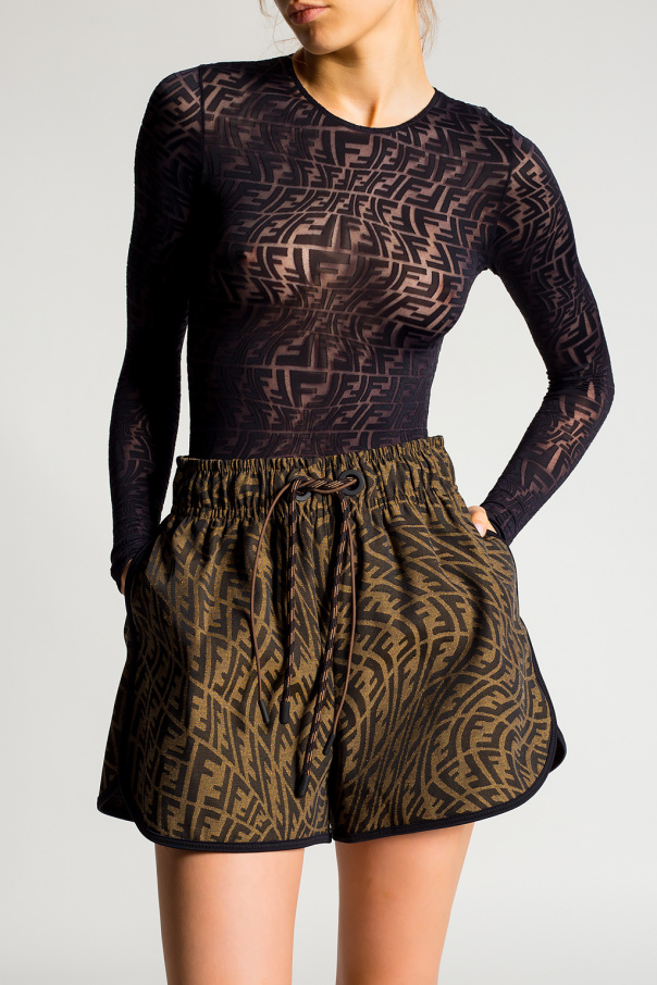 Black transparent body from Fendi. This long sleeve design features a black F monogram pattern, round neck and long sleeves. Comes with a pouch.