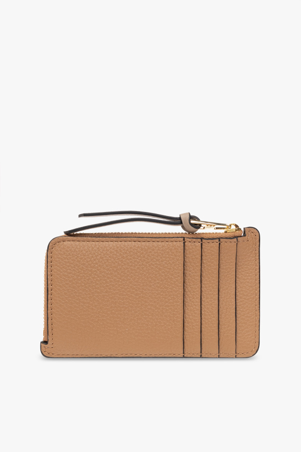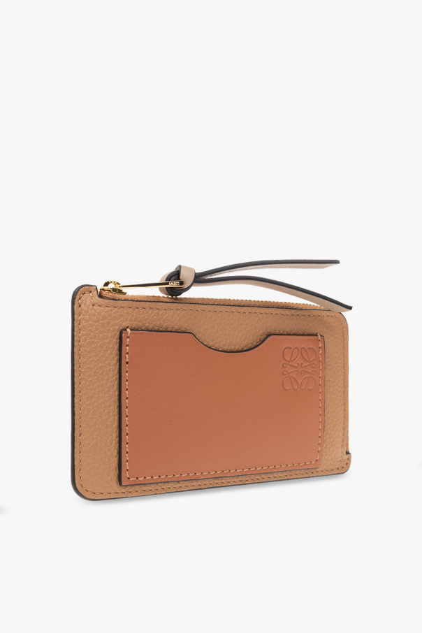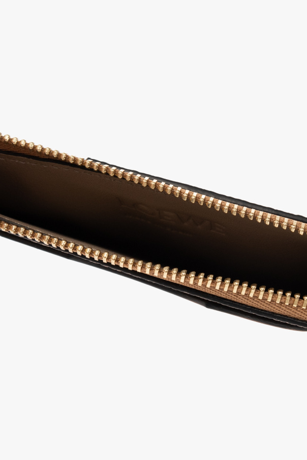 Brown card case from Loewe. Made of calf leather, this item features a frontal card slot with an embossed logo, one zip pocket, gold-tone metal hardware and four card slots at the back.