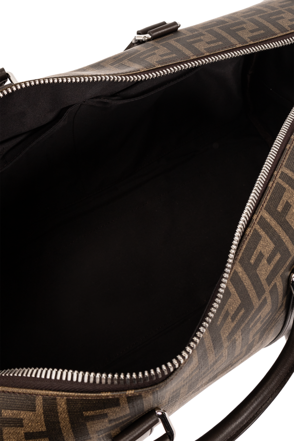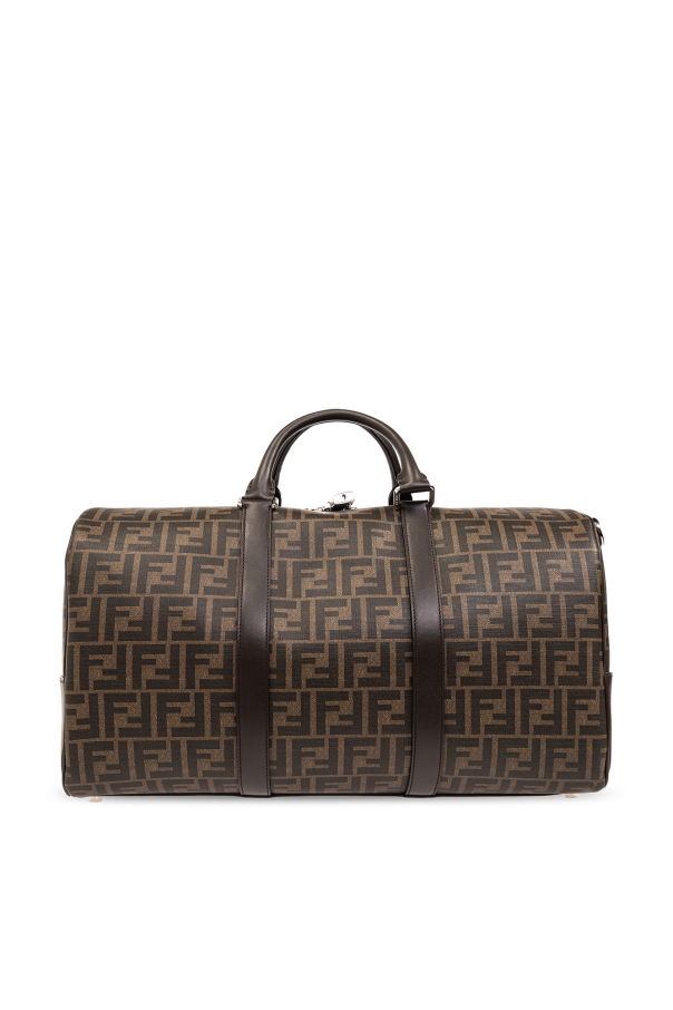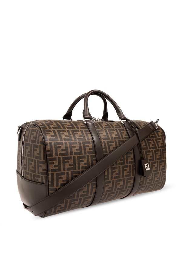Brown duffel bag from Fendi. Made from ‘FF’ canvas, this design fastens via a two-way zip and showcases a monogram pattern, two half-round handles, silver-tone metal hardware as well as a detachable shoulder strap and one internal compartment with four slip pockets.