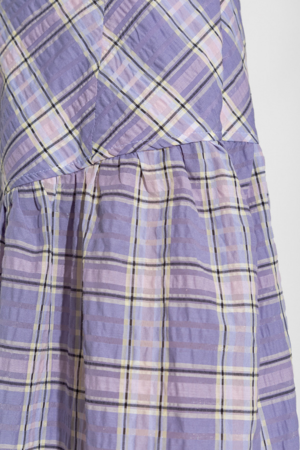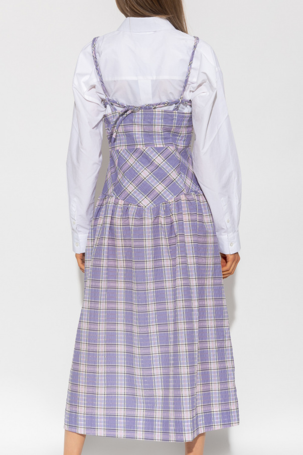 Light purple midi dress with double straps from Ganni. Crafted from a blend of organic cotton and recycled material, this style showcases a colourful check pattern inlaid with glossy yarn, a hidden zipper on the side and a buckle strap at the back. It is complete with decorative eyelets, bustier inspired bust, a dropped waist and a flared hem.