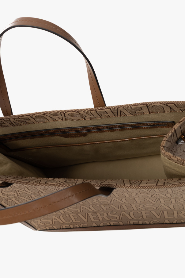 Beige and brown shopper bag from Versace. Crafted from canvas with a jacquard logo motif and trimmed with calf leather, this design features a detachable and adjustable shoulder strap, two half-round handles, gold-tone metal elements and one internal compartment with one slip pocket and one zip pocket.
