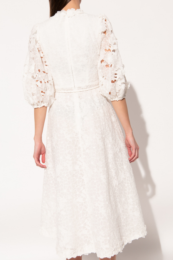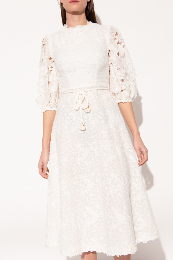 White dress from Zimmermann. Embroidered with a floral pattern, this style features a round neck, a back zip closure, a woven belt with fringes and shell ends, short puff sleeves and a cotton lining.