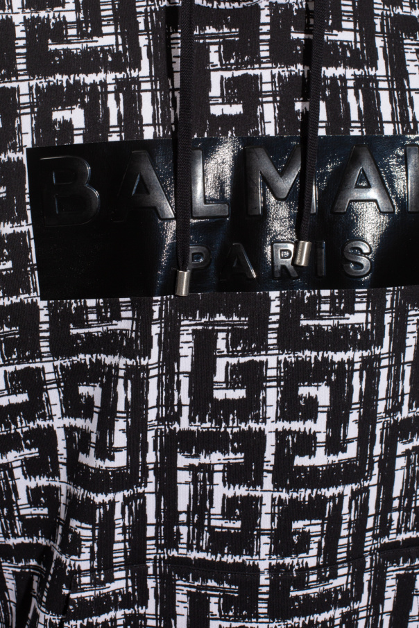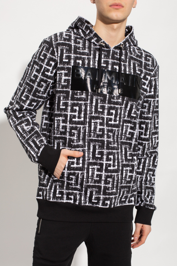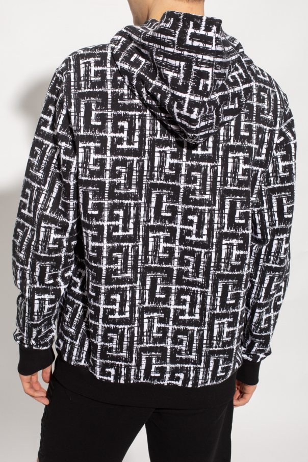 Black and white sweatshirt with a drawcord-adjustable hood from Balmain. Crafted from cotton jersey, this style features a monogram pattern, a black logo print, a kangaroo pocket and a ribbed bottom hem and cuffs.