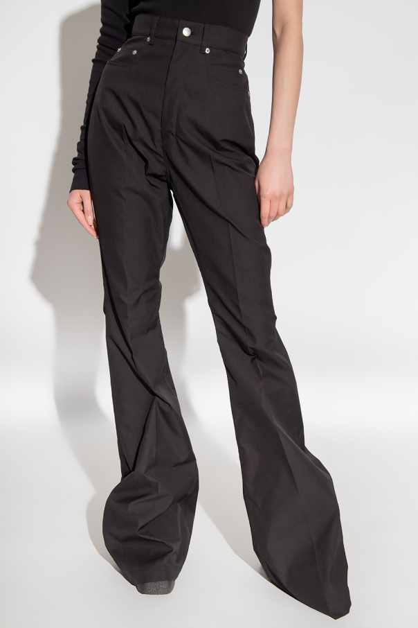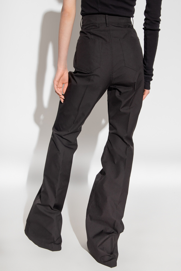 Black trousers from Rick Owens. Fastened with a zip and button, this pair falls down with slightly tapered legs is complete with five slip pockets.