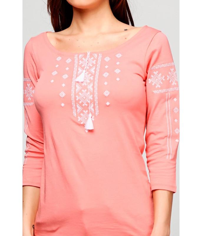 Колись в давнину вишиванка для українського народу була етнічним одягом, але на даний час вона здобула визначне значення в житті багатьох людей, стала для них манерою самовираження.Жіноча вишита футболка оранжевого кольору з вишитим ¾ рукавом. Горловина стягується шнурком з кутасиками. Дана модель має назву “Святкова”. Орнамент вишивки на футболці в сіро - білих тонах неперевершено - красивий, він додасть чарівного вигляду кожній дівчині. Він складається з різних геометричних фігур: ромбів, трикутників та стрічок. Поєднання всіх цих знаків в сукупності несуть в собі світло, добро, тепло та початок життя.