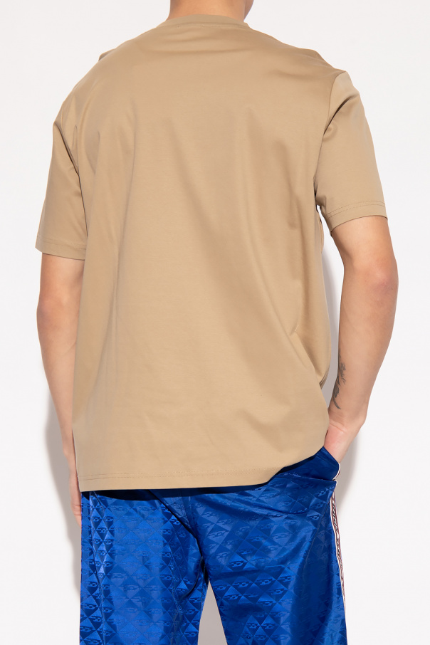 Beige ‘T-JUST-DOVAL’ crewneck T-shirt from Diesel. Crafted from cotton, this style features short sleeves, an elasticated collar and a black and white logo-shaped patch.