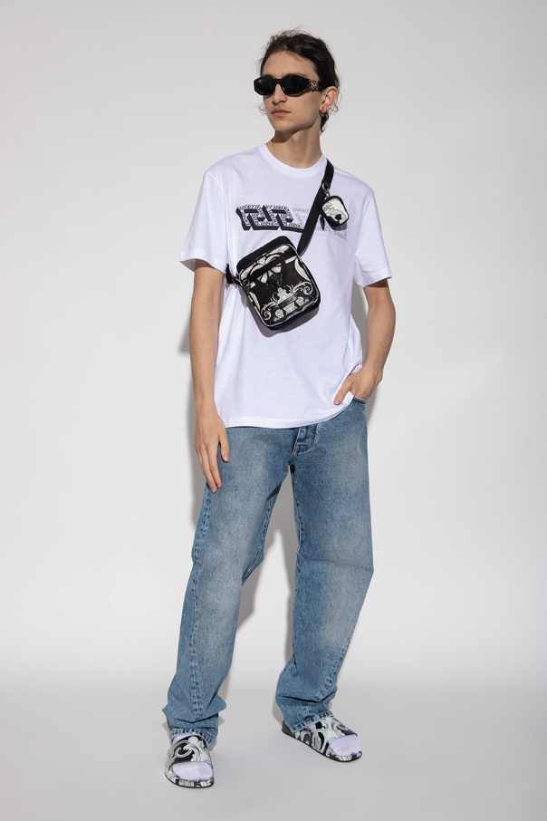 Black, white and grey slides from Versace. Made of rubber, this model showcases the brand\'s signature Barocco print.