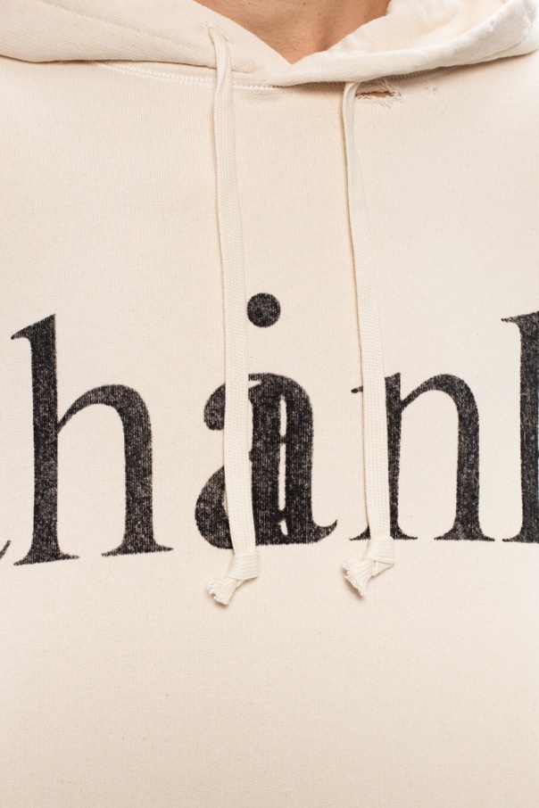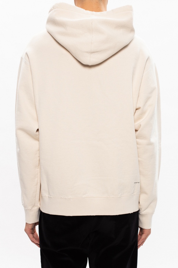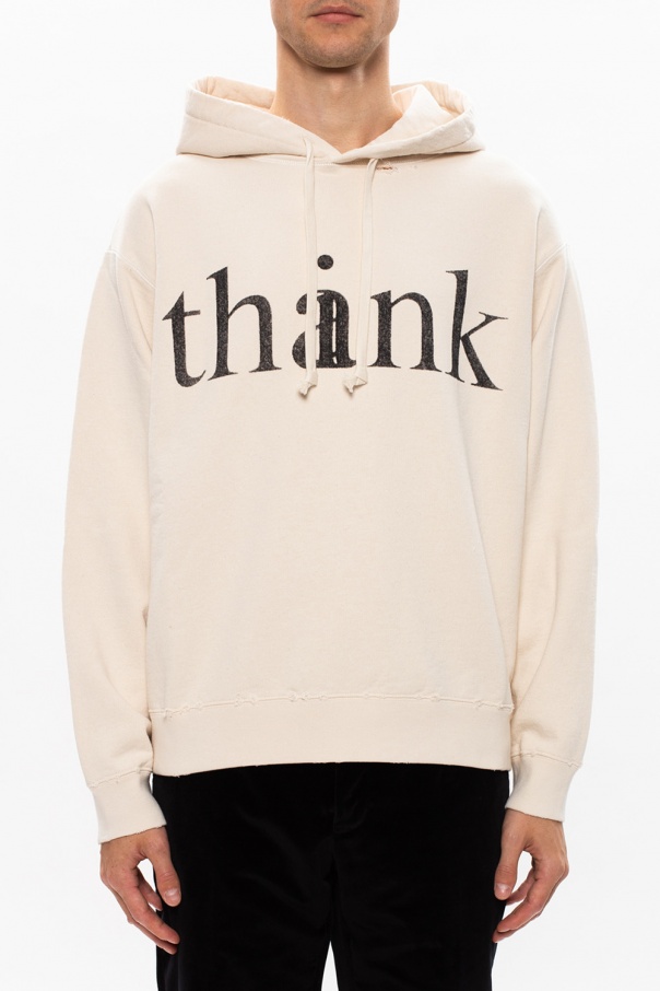 Cream sweatshirt with a drawcord-adjustable hood from Gucci. Crafted from cotton jersey, this hoodie showcases distinctive holes, black graphic print with logo on the front and ribbed finishes at the bottom hem and cuffs.