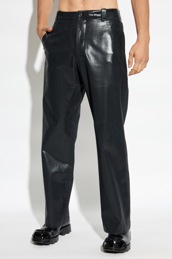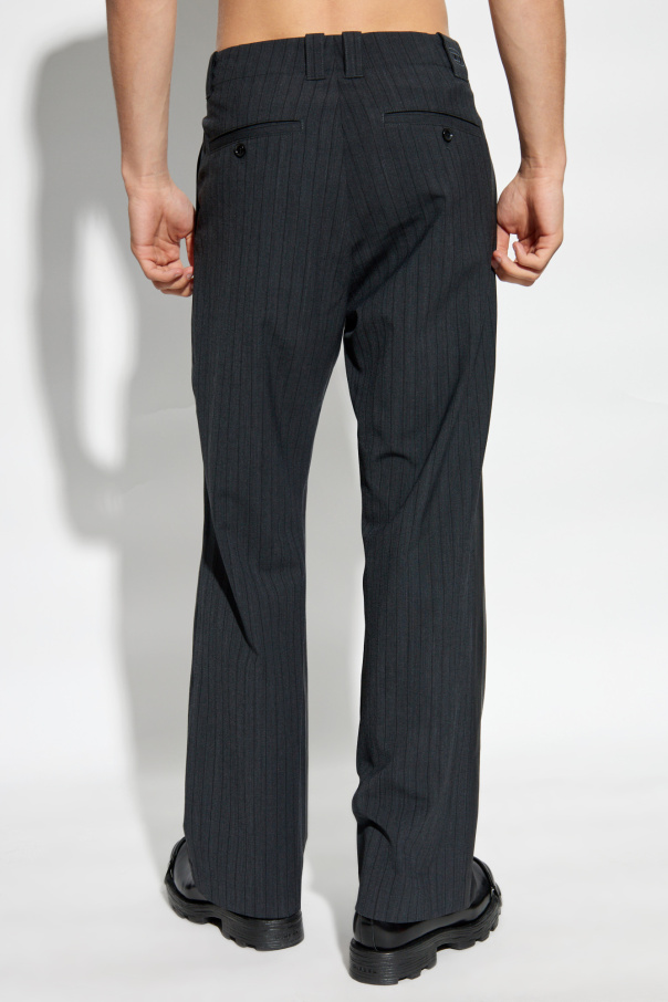 Introducing the P-STANLEY trousers from Diesel, an epitome of sartorial elegance and casual sophistication. Meticulously crafted from a premium blend of polyester, wool, and elastane, these trousers exhibit a subtly sheen finish that enhances their luxurious appeal. The classic, straight-cut design with slightly flared legs ensures a timeless silhouette, while the subtle vertical pinstripe pattern adds a touch of refinement. Featuring a traditional button and zipper closure, these trousers are adorned with a discreet embroidered designer logo on the waistband, enhancing their exclusive nature. Functional yet stylish, the P-STANLEY trousers boast two side pockets and two back pockets secured with buttons, providing ample storage without compromising on style. The waistband is equipped with belt loops, and a subtle designer logo accentuates one of the loops, underscoring Diesel\'s commitment to detail and quality. Why Choose This Product? Luxurious Material: Crafted from a premium blend of polyester, wool, and elastane. Elegant Design: Classic straight-cut with a subtle pinstripe pattern. Functional Details: Four pockets and belt loops for practicality. Exclusive Accents: Embroidered logo and designer details for a touch of sophistication. Versatile Color: Timeless black, perfect for any occasion.