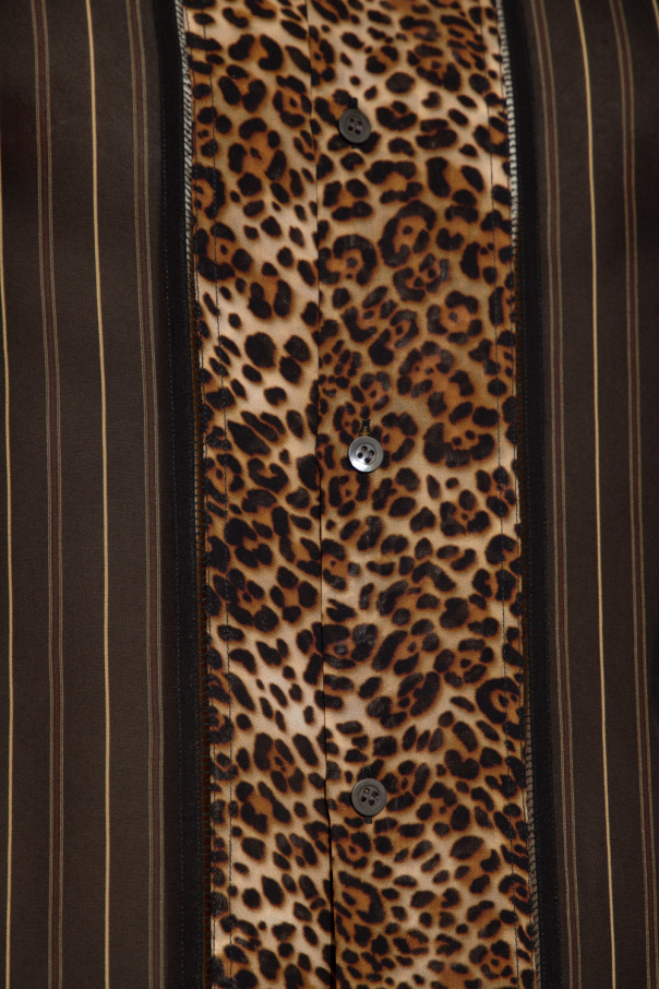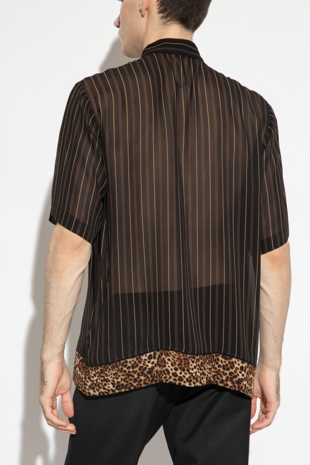 Black, brown and cream shirt from Dries Van Noten. Embellished with a floral pattern and stripe, this style features button fastenings and short sleeves.