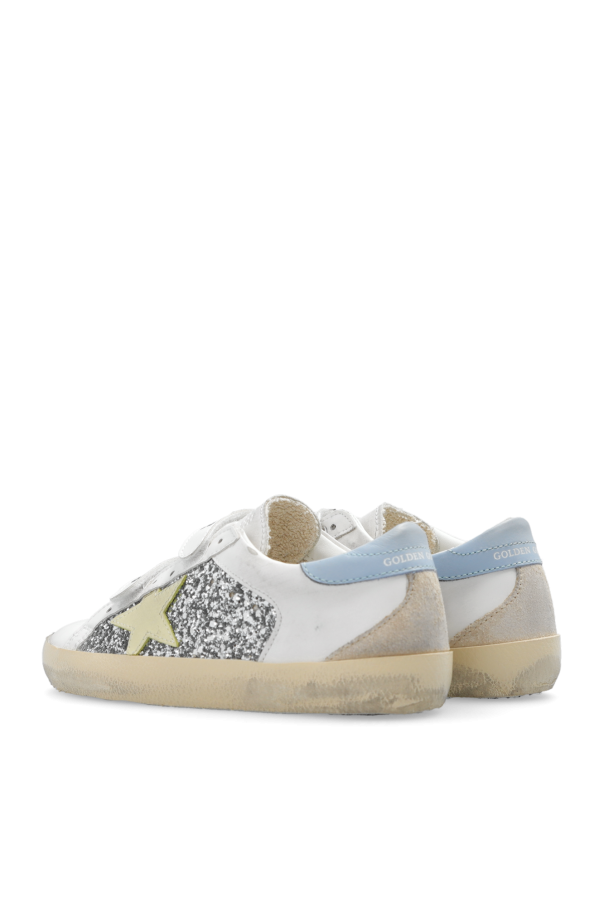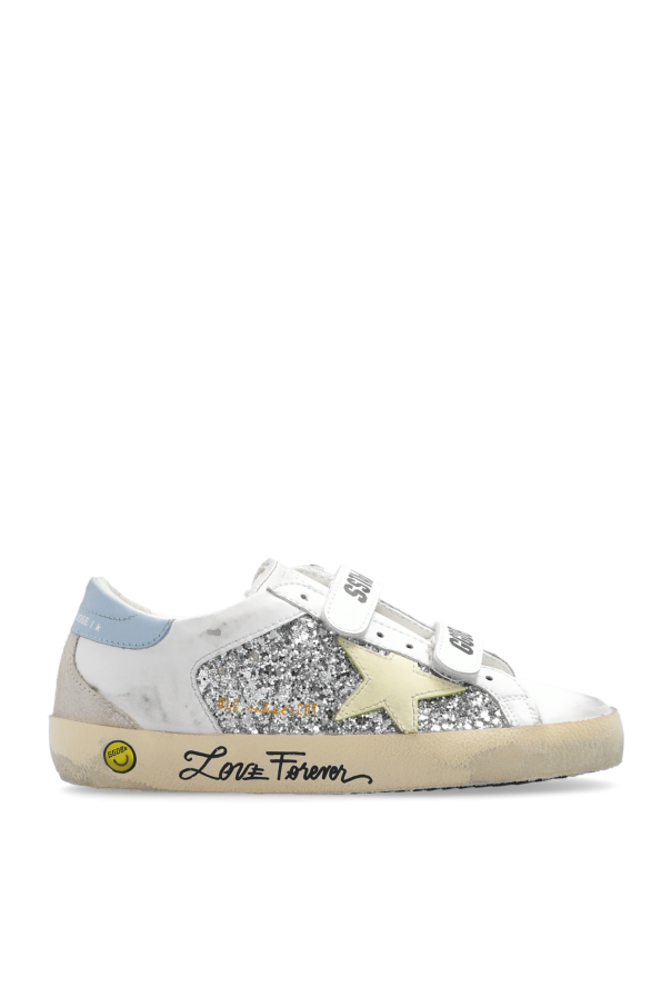 White ‘Old School’ distressed sneakers with a vintage effect from Golden Goose Kids. Crafted from leather, this pair features velcro straps, silver-tone glitter, the iconic star in light yellow, logo motif, light blue heel counter and rubber sole in black and cream.
