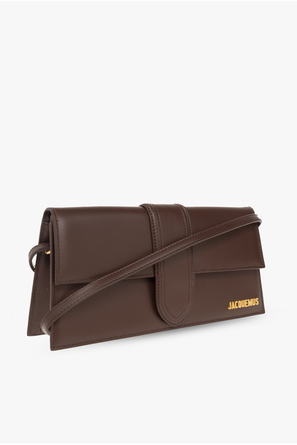 Dark brown ‘Le Bambino Long’ shoulder bag from Jacquemus. Made of leather, this design secures with a magnetic fastener and features a flap accentuated with a logo plaque, a back slip pocket, a detachable shoulder strap, gold-tone metal hardware and one internal compartment with a card slot.